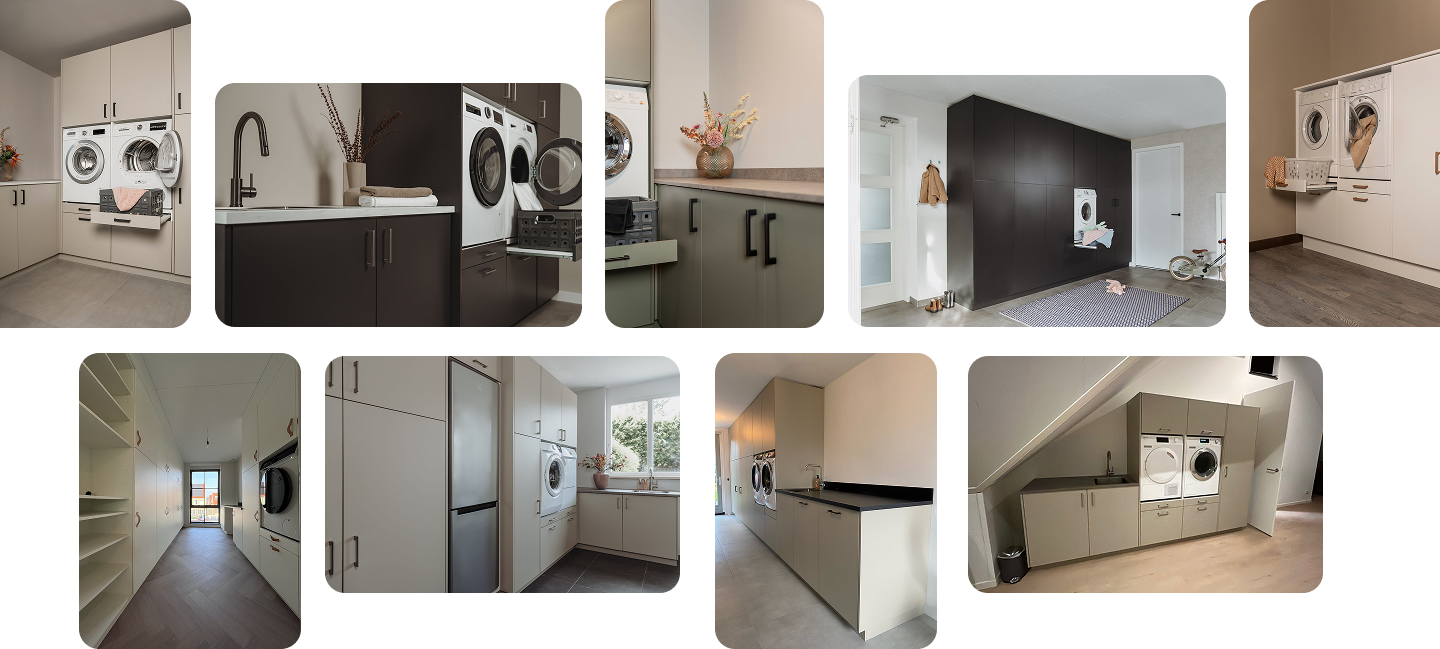 Ontwerp een unieke wasmachinekast op maat. Of je nu een schuine wand hebt, extra opbergruimte zoekt, of een werkblad wilt boven je wasmachine: wij maken het passend.